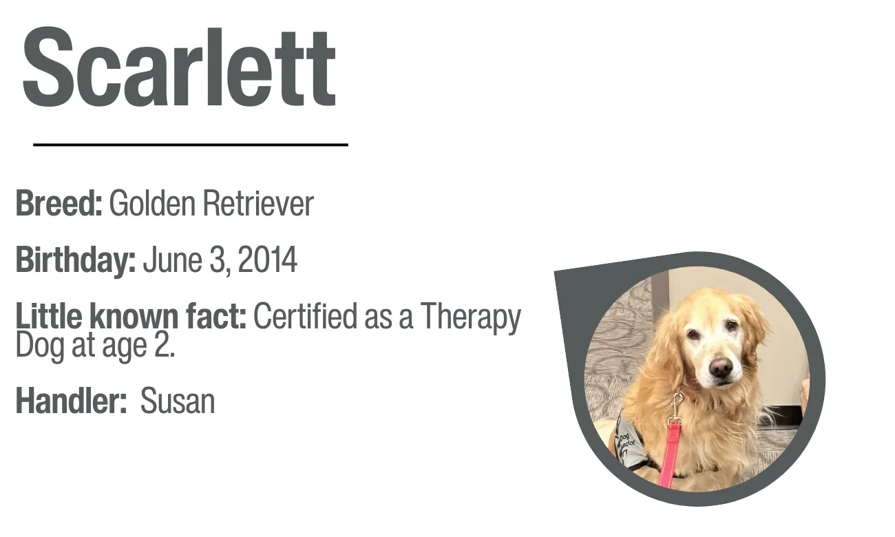 Whether you're missing your pet from home or just need a break, everyone is welcome to stop by and enjoy some quality time with our friendly therapy dogs.